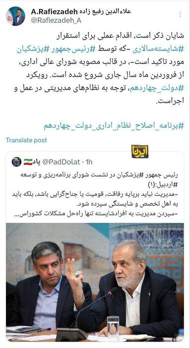 ایران آنلاین: علاءالدین رفیعزاده در صفحه شخصی خود در فضای مجازی در لبیک به سخنان امروز رئیس جمهور اسلامی ایران در نشست شورای برنامهریزی و توسعه استان اردبیل که گفت «مدیریت نباید بر پایه رفاقت، قومیت یا جناحگرایی باشد، بلکه باید به اهل تخصص و شایستگی سپرده شود؛ سپردن مدیریت به افراد شایسته تنها راهحل مشکلات کشور است»، اظهار کرد: «شایان ذکر است، اقدام عملی برای استقرار شایستهسالاری که توسط رئیسجمهور مورد تاکید است، در قالب مصوبه شورای عالی اداری، از فروردین ماه سال جاری شروع شده است.»