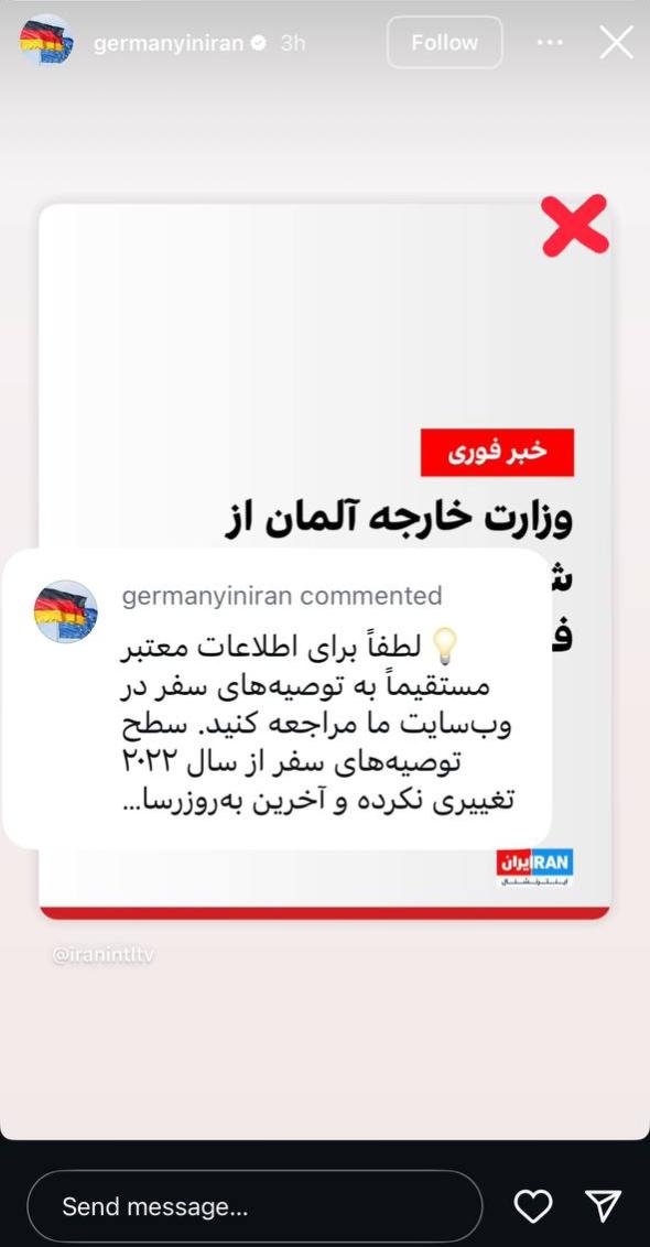 فاطمه اسکندری _ گروه راستی آزمایی ایران آنلاین: در پی انتشار شایعاتی در فضای مجازی درباره «هشدار وزارت خارجه آلمان مبنی بر ترک فوری ایران و احتمال لغو پروازها»، سفارت آلمان در تهران با انتشار استوری در صفحه رسمی اینستاگرام خود، این ادعاها را رد و اعلام کرد: