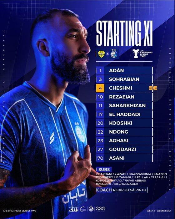 آنتونیو آدان – عارف آقاسی – آرمین سهرابیان – رامین رضاییان – حسین گودرزی – روزبه چشمی – دیدیه اندونگ – منیر الحدادی – یاسر آسانی – علیرضا کوشکی – سعید سحرخیزان نفراتی هستند که در ترکیب استقلال به میدان خواهند رفت.