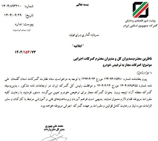 به گزارش مهر، در این ابلاغیه آمده است: پیرو بخشنامه شماره ۱۲۴/۹۴/۷۵۴۸۰ مورخ ۱۳۹۴/۴/۲۴ با توجه به درخواست ستاد نظارت گمرکات استان گلستان طی نامه شماره ۱۴۰۴/۸۶۵۶۵۵ مورخ ۱۴۰۴/۶/۲۶ و موافقت رئیس کل گمرک ایران در ارجاعات نامه مذکور، بدین وسیله گمرک منطقه آزاد اینچه برون بعنوان گمرک مجاز برای ترخیص خودرو تعیین میگردد. دستور فرمایید با رعایت کلیه مقررات مربوطه اقدام لازم معمول نمایند.