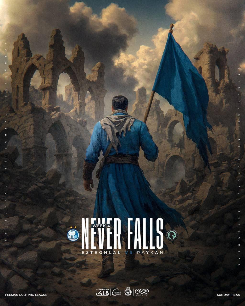در سوی مقابل، استقلالیها پاسخ متفاوتی به این پوستر دادند. آبیها تصویر یک جنگجو با شنل آبی و پرچمی در دست منتشر کردند که در میان خرابههای یک قلعه ایستاده است. روی این پوستر عبارت «هرگز سقوط نمیکند» نوشته شده بود که به عنوان روی پا ایستادن این تیم پس از شکست سنگین برابر الوصل است.