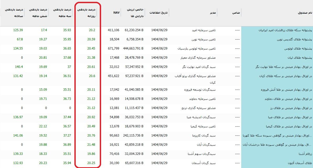 در اتفاقی عجیب، بازدهی روزانه برخی صندوقهای طلا و سکه در معاملات دیروز ۲۹ شهریور بین مثبت ۱۵ تا ۲۰ درصد شده بود.