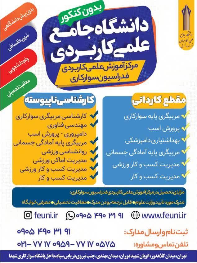 ثبت نام پذیرش دانشجو در نیمسال اول سال تحصیلی ۱۴۰۵-۱۴۰۴ مرکز آموزش علمی کاربردی فدراسیون سوارکاری آغاز شد.