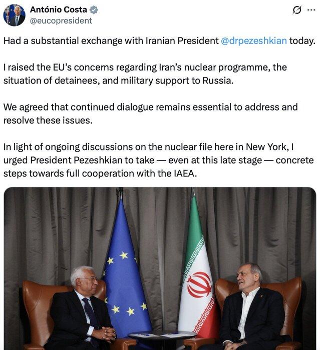 ایران آنلاین: آنتونیو کوستا با انتشار پیامی در شبکه اجتماعی ایکس نوشت: امروز گفت وگویی مفصل با رئیسجمهور ایران، آقای دکتر پزشکیان داشتم.