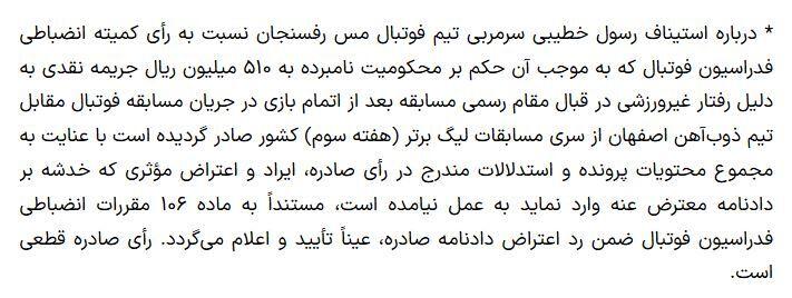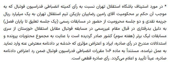 ایران آنلاین: طبق این رأی قاطع، اعتراضهای رسمی باشگاههای پرسپولیس و استقلال به همراه اعتراض رسول خطیبی (سرمربی سابق تیم ملی و ...) به طور کامل رد شد.