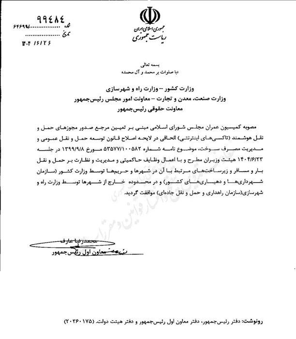 ایران آنلاینانتشار نامه ای با امضای محمدرضا عارف معاون اول رئیس جمهور درباره طرحی که در مجلس درباره فعالیت تاکسی های اینترنتی در دستور کار کمیسیون عمران قرار دارد، این شائبه را ایجاد کرد که دولت موافق محدودسازی این کسب و کارهای نوین است و قصد دارد صدور مجوز آنها را در محدوده شهرها به وزارت کشور و در خارج از شهرها به وزارت راه تفویض کند در حالی که بررسی های خبرنگار ایرنا از وزارت ارتباطات و نیز اتحادیه کسب و کارهای مجازی این گزاره را تایید نمی کند.
