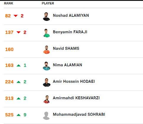 در این رنکینگ، نوشاد عالمیان و بنیامین فرجی هر کدام دو پله تنزل جایگاه داشتند. نیما عالمیان و امیرحسین به ترتیب یک و دو پله صعود کردند.