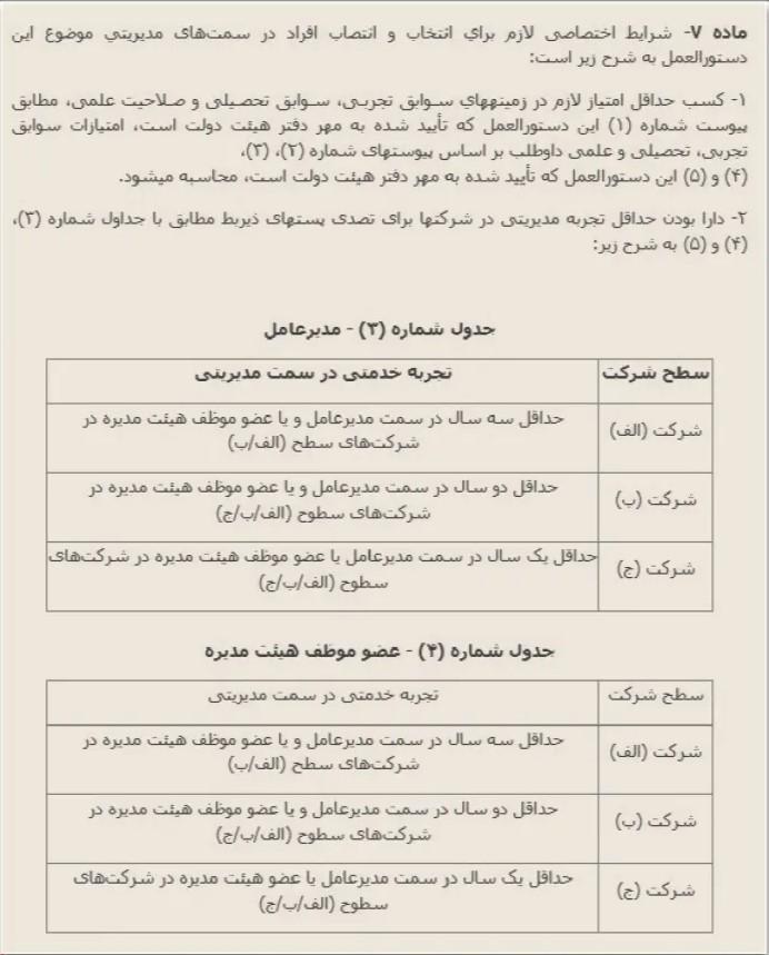 چنانکه مدیرعاملی شرکت سطح الف به حداقل ۳ سال در سمت مدیرعامل یا عضو موظف هیأتمدیره در شرکتهای سطح الف و ب؛ مدیرعاملی شرکت سطح ب به حداقل ۲ سال در سمت مدیرعامل یا عضو موظف هیأتمدیره در شرکتهای سطوح (الف/ب/ج) و شرکت (ج) به حداقل یک سال در سمت مدیرعامل یا عضو موظف هیأتمدیره در شرکتهای سطوح (الف/ب/ج) نیازمند است. دستورالعملی که هر گونه انتصاب مدیران بدون پیشینه و تجربه مدیریتی و انتصابات به صرف روابط گروهی و خویشاوندی را منتفی میسازد.
