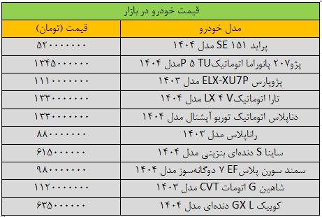 پژو ۲۰۷ TU۳ مدل ۱۴۰۴ نیز با نرخ ۸۸۰ میلیون تومان در بازار دیده شد. پژو پارس ELX-XU۷P مدل ۱۴۰۳ در محدوده قیمتی یک میلیارد و ۱۱۰ میلیون تومان قرار گرفت و مدل XU۷P همین خودرو نیز به یک میلیارد و ۱۰ میلیون تومان رسید.