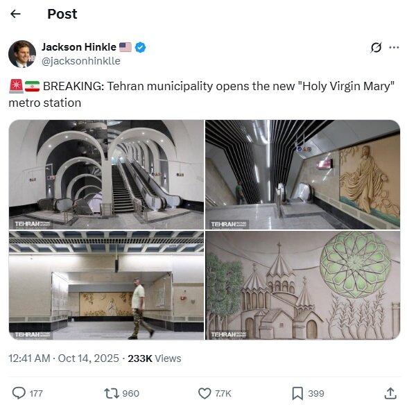 «جکسون هینکل» کاربر آمریکایی ایکس در پیام خود تصاویری از ایستگاه جدید متروی تهران منتشر کرد و نوشت: خبر فوری؛ شهرداری تهران ایستگاه جدید متروی «مریم مقدس» را افتتاح کرد.