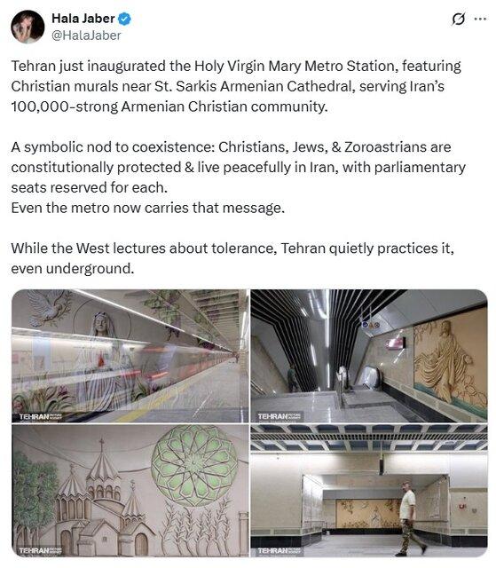 همچنین «حلا جابر» نویسنده انگلیسی در صفحه شخصی خود در ایکس خاطر نشان کرد: تهران به تازگی ایستگاه متروی مریم مقدس را افتتاح کرده است که نقاشیهای دیواری مسیحی را در نزدیکی کلیسای جامع ارمنی سنت سرکیس به نمایش میگذارد و به جامعه ۱۰۰هزار نفری ارمنی مسیحی ایران خدمترسانی میکند.