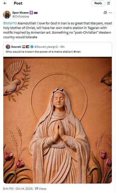 کاربر دیگری به نام «سنت آداگویله» که در شبکه اجتماعی ایکس خود را مسیحی کاتولیک معرفی کرده است، از ایجاد یک ایستگاه مترو با المانهای مربوط به حضرت مریم استقبال و اعلام کرد: ایران از ایستگاه متروی جدید «مریم مقدس» در تهران که با نمادهای مسیحی تزئین شده است، رونمایی کرد. او در ادامه به زبان اسپانیایی نوشت «درود بر مریم».