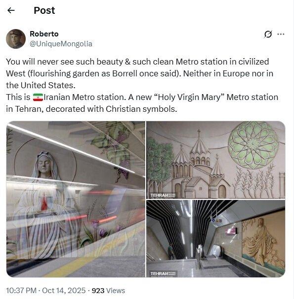 «رابرتو» کاربر روس دیگری است که در این باره نوشت: شما هرگز چنین ایستگاه متروی زیبا و تمیزی را در غرب متمدن (باغ شکوفا، همانطور که بورل زمانی گفته بود) نخواهید دید. نه در اروپا و نه در ایالات متحده. این ایستگاه متروی ایرانی است. یک ایستگاه متروی جدید «مریم مقدس» در تهران که با نمادهای مسیحی تزئین شده است.
