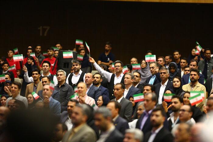 اجرای اشعار حماسی و سرود «ای ایران» توسط شرکتکنندگان حاضر در سالن نیز حال و هوایی شورانگیز به مراسم بخشید.