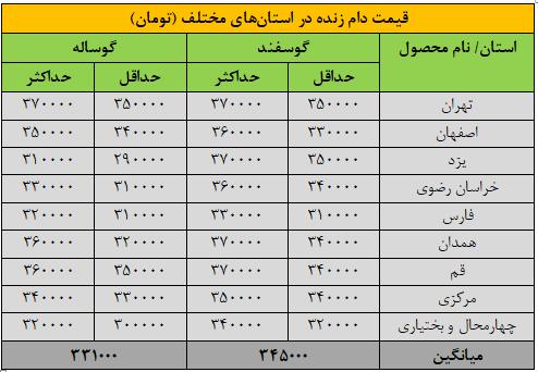 در استان تهران، هر کیلو گوسفند زنده بین ۳۵۰ تا ۳۷۰ هزار تومان قیمت‌گذاری شده و گوساله زنده نیز در همین بازه قیمتی یعنی از ۳۵۰ تا ۳۷۰ هزار تومان به فروش می‌رسد.