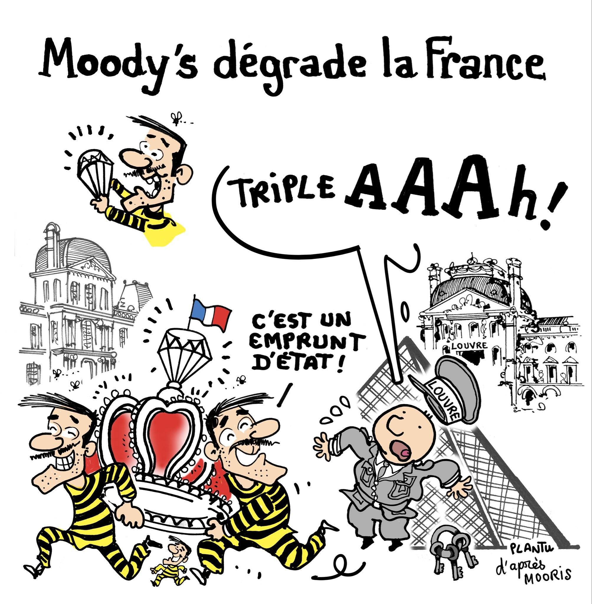 در تصویری دیگری نیز با اشاره به کاهش رتبه اعتباری فرانسه به دلیل بدهی و کسری بودجه، از زبان یکی از سارقان نوشته شده است: متاسفم! باید بدهیهایم را بدهم.