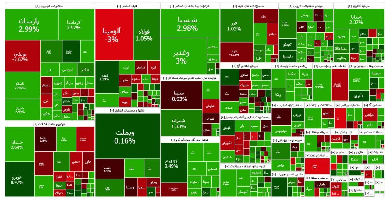 در پایان معاملات بیش از ۷۲ درصد نمادها (۵۷۱ نماد) در محدوده مثبت قرار گرفتند.