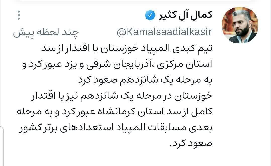 توییت کمال آل کثیر در تقدیر از تیم کبدی المپیاد خوزستان