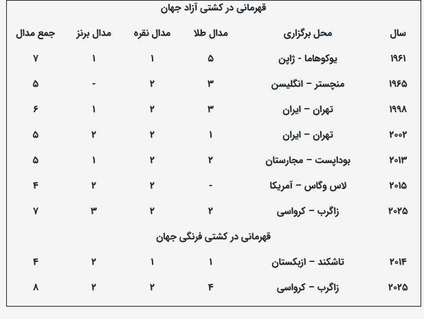 همچنین تیمهای ملی کشتی آزاد و فرنگی ایران برای اولین بار در تاریخ به صورت همزمان و با کسب ۱۵ مدال رنگارنگ شامل ۶ مدال طلا، ۴ مدال نقره و ۵ مدال برنز در رقابت جهانی ۲۰۲۵ کرواسی بعنوان قهرمانی دست یافتند.