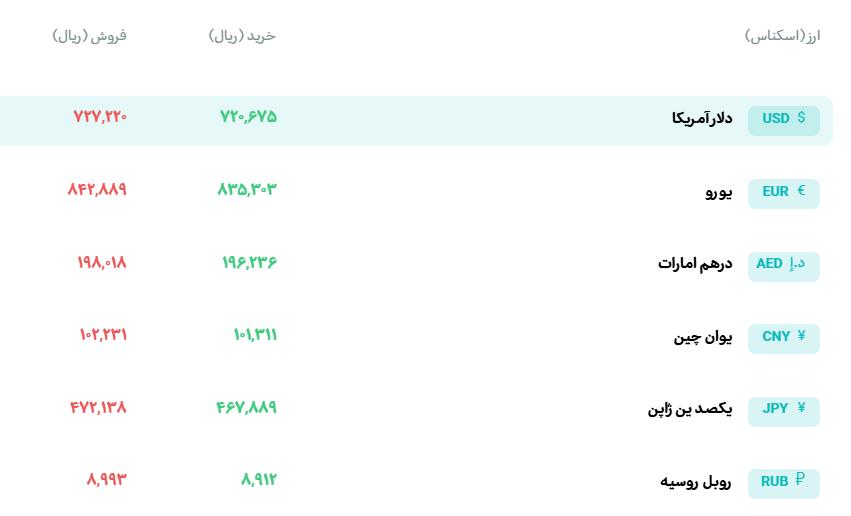 امروز در مرکز مبادله ارز و طلای ایران هر اسکناس دلار آمریکا ۷۲ هزار و ۷۲۲ تومان، هر یورو ۸۴ هزار و ۲۸۸ تومان و درهم امارات ۱۹ هزار و ۸۰۱ تومان به فروش رفت و در بازار حوالجات نیز هر دلار آمریکا ۷۰ هزار و ۶۰۳ تومان، یورو ۸۱ هزار و ۸۳۳ تومان و درهم امارات ۱۹ هزار و ۲۲۵ تومان بین بازرگانان داد و ستد شد.