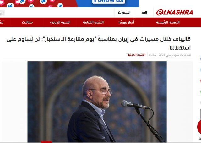 وبگاه «النشره» نیز با تمرکز بر سخنان «محمدباقر قالیباف» رئیس مجلس شورای اسلامی، نوشت که او در مراسم تهران تأکید کرد: «ملت ایران در هیچ شرایطی بر سر استقلال خود معامله نخواهد کرد و مقاومت در برابر استکبار، ریشه در باور عمیق دینی و تاریخی ایرانیان دارد.»
