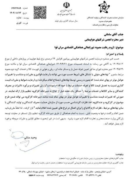 درپی انتشار اخباری مبنی بر ”افرایش ۲۴ درصدی نرخ بلیت هواپیما” سازمان حمایت مصرف‌کنندگان طی نامه‌ای از انجمن شرکت‌های هواپیمایی خواسته که قیمت بلیت‌ها را به قبل بازگردانند، در غیر این صورت مطابق قانون با آنها برخورد خواهد شد.