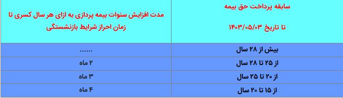 مدیرکل نام نویسی و حساب‌های انفرادی سازمان تأمین اجتماعی گفت: براین اساس مدت افزایش سنوات بیمه پردازی به ازای هر سال تا زمان احراز شرایط بازنشستگی برای افرادی از ۲۵ سال تا ۲۸ سال تمام سابقه پرداخت حق بیمه دارند ۲ماه به ازای هر سال کسری تا زمان احراز شرایط بازنشستگی خواهد بود.