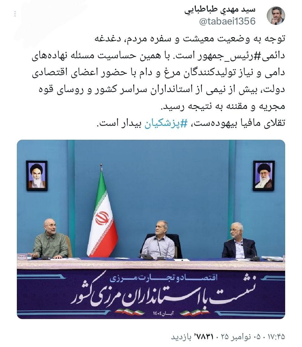 ایران آنلاین: سید محمدمهدی طباطبایی در حساب کاربری خود در شبکه اجتماعی ایکس نوشت: توجه به وضعیت معیشت و سفره مردم، دغدغه دائمی رئیس جمهور است. با همین حساسیت مسئله نهادههای دامی و نیاز تولیدکنندگان مرغ و دام با حضور اعضای اقتصادی دولت، بیش از نیمی از استانداران سراسر کشور و روسای قوه مجریه و مقننه به نتیجه رسید. تقلای مافیا بیهودهست؛ پزشکیان بیدار است.