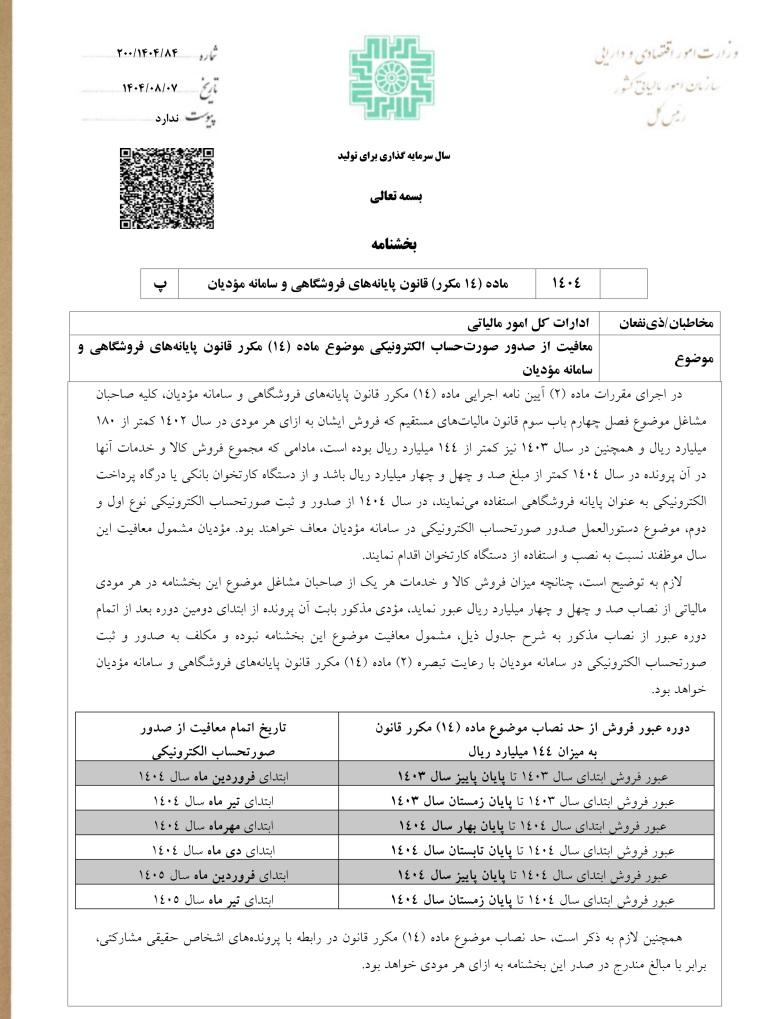 مطابق مفاد این بخشنامه، صاحبان مشاغلی که فروششان به ازای هر مؤدی در سال ۱۴۰۲ کمتر از ۱۸ میلیارد تومان و در سال ۱۴۰۳ نیز کمتر از ۱۴.۴ میلیارد تومان بوده است، تا زمانی که مجموع فروش کالا و خدمات آنها در آن پرونده در سال ۱۴۰۴ کمتر از مبلغ ۱۴.۴ میلیارد تومان باشد و از دستگاه کارتخوان بانکی یا درگاه پرداخت الکترونیکی به عنوان پایانه فروشگاهی استفاده می کنند، در سال ۱۴۰۴ از صدور و ثبت صورتحساب الکترونیکی نوع اول و دوم در سامانه مؤدیان معاف خواهند بود.