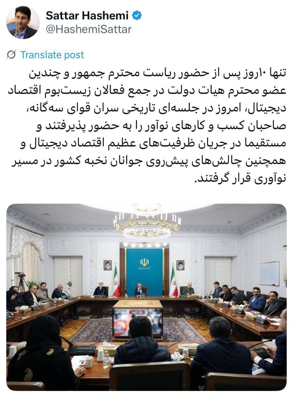 ایران آنلاین: سیدستار هاشمی، وزیر ارتباطات و فناوری اطلاعات در شبکه اجتماعی ایکس نوشت: «تنها ۱۰روز پس از حضور ریاست محترم جمهور و چندین عضو محترم هیئت دولت در جمع فعالان زیستبوم اقتصاد دیجیتال، امروز در جلسهای تاریخی سران قوای سهگانه، صاحبان کسب و کارهای نوآور را به حضور پذیرفتند و مستقیماً در جریان ظرفیتهای عظیم اقتصاد دیجیتال و همچنین چالشهای پیشروی جوانان نخبه کشور در مسیر نوآوری قرار گرفتند.»