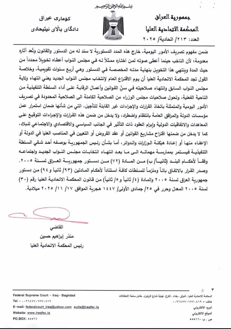 دادگاه عالی فدرال عراق پایان اختیارات کامل پارلمان و دولت را اعلام کرد