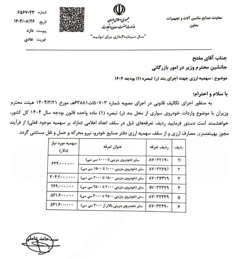 ایران آنلاین: سید حامد عاملی در نامه ای به محمدصادق مفتح جانشین وزیر در امور بازرگانی اعلام کرد: به منظور اجرای تکالیف قانونی در اجرای مصوبه شماره ۵۰۷۰۳/ت ۶۳۸۸۱ ه- مورخ ۱۴۰۴/۳/۲۱ هیات محترم وزیران با موضوع واردات خودروی سواری از محل بند(ر) تبصره (۱) ماده واحد قانون بودجه سال ۱۴۰۴ کل کشور، خواهشمند است، دستور فرمایید ردیف تعرفه های ذیل در سقف اعداد اعلامی از فرایند مجوز سهمیه بهینه سازی مصارف ارزی و از سقف سهمیه ارزی دفتر صنایع خودرو، نیرو محرکه و حمل و نقل مستثنی شود.