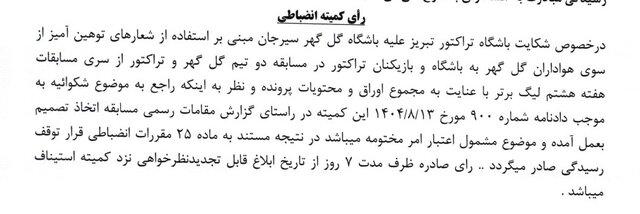 رای دعوی باشگاه تراکتور به طرفیت باشگاه گل گهر سیرجان به شرح زیر است: