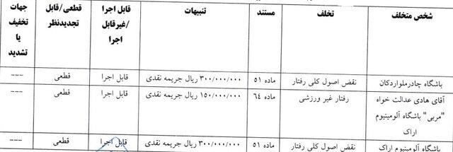 رای تخلفات عدالت خواه و باشگاه آلومینیوم و همچنینی تیم چادر ملو به شرح زیر است: