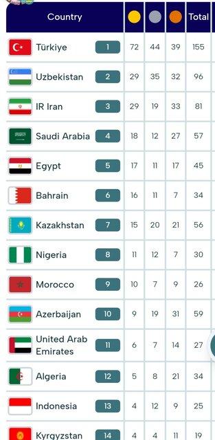 ترکیه ۷۲ طلا، ۴۴ نقره و ۳۹ برنز در رده نخست و ازبکستان با ۲۹ طلا، ۳۵ نقره و ۳۲ برنز در رده دوم قرار گرفتند.
