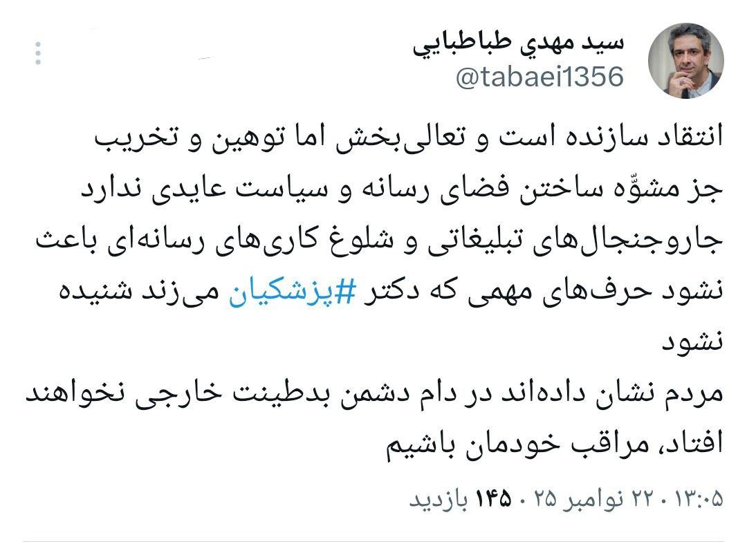 ایران آنلاین: مهدی طباطبایی در حساب کاربری خود در شبکه اجتماعی ایکس نوشت: «انتقاد سازنده است و تعالیبخش اما توهین و تخریب جز مشوّّه ساختن فضای رسانه و سیاست عایدی ندارد؛ جاروجنجالهای تبلیغاتی و شلوغ کاریهای رسانهای باعث نشود حرفهای مهمی که دکتر پزشکیان میزند شنیده نشود. مردم نشان دادهاند در دام دشمن بدطینت خارجی نخواهند افتاد، مراقب خودمان باشیم.»