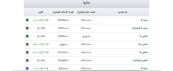 بیشترین افزایش قیمت در گروه خودروسازی سایپا به خودروهای سایپا ۱۵۱ GX و سایپا ۱۵۱ GX (لاینر) با ۱۷ تا ۱۸ میلیون تومان اختصاص دارد این خودروها در رنج قیمتی ۵۸۳ تا ۵۸۹ میلیون تومان معامله شدند. اطلس GL با ۱۵ میلیون تومان و اطلس G با پنج میلیون تومان افزایش روبرو بودند.