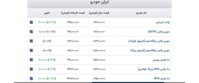 گروه خودرویی دنا در مدل های دنا پلاس بورسی با ۱۶ میلیون تومان، دنا پلاس رینگ با ۱۳ میلیون تومان و دنا پلاس MT6 با ۱۰ میلیون و دنا پلاس اتوماتیک ۱۱ میلیون تومان افزایش قیمت داشت.
