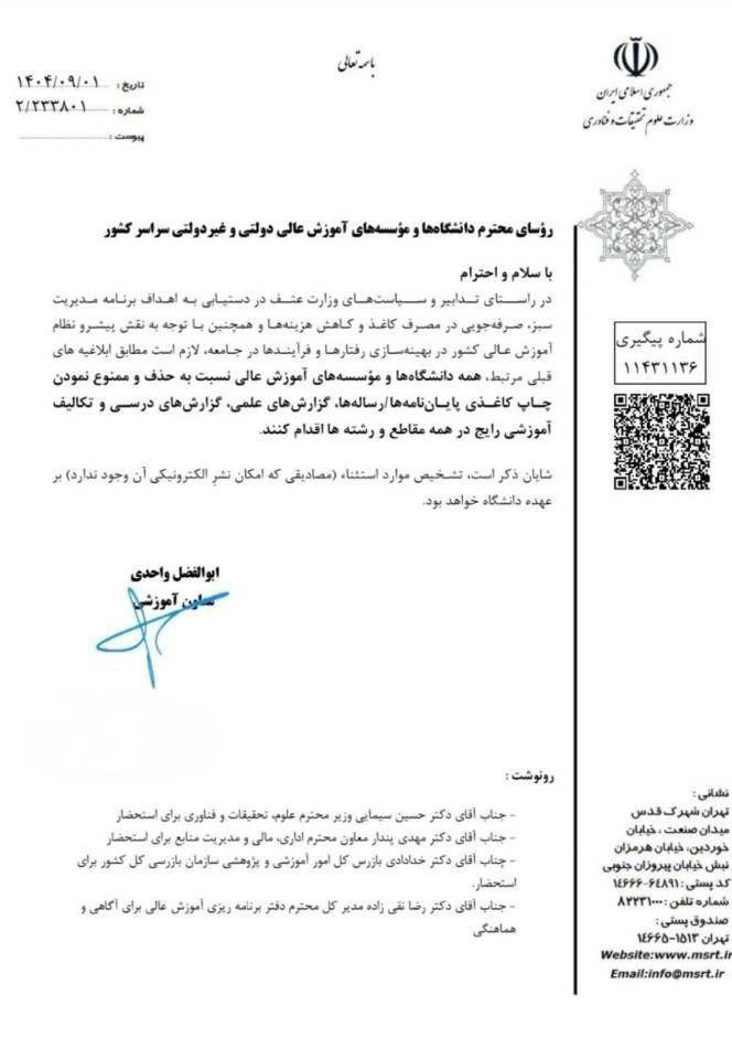 وزارت علوم، تحقیقات و فناوری، ممنوعیت چاپ کاغذی پایاننامهها، رسالهها، گزارشهای علمی و تکالیف درسی از سوی دانشگاهها و مراکز آموزش عالی را ابلاغ کرد.