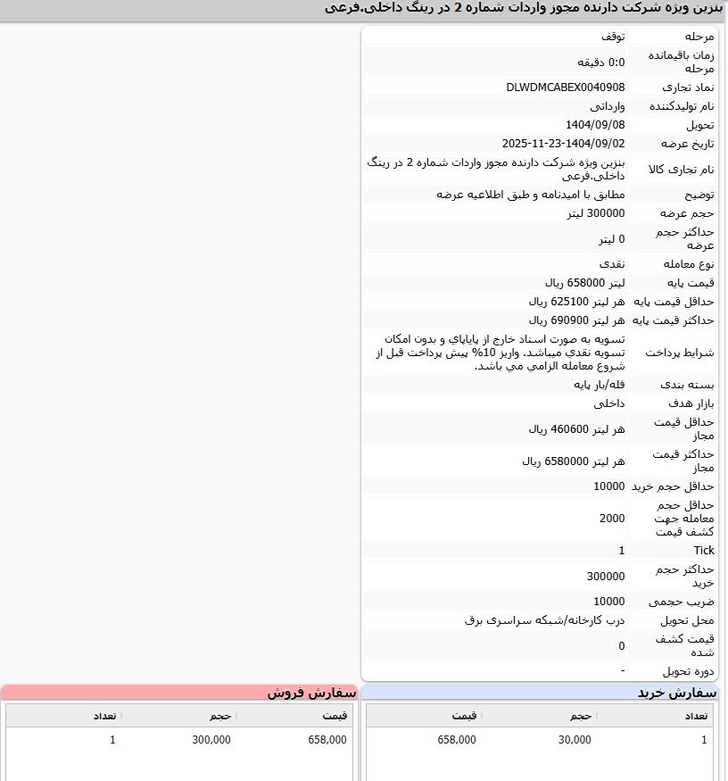 به گزارش ایرنا، در حالی که سفارش فروش ۳۰۰ هزار لیتر بود، امروز یک فقره سفارش خرید به حجم ۳۰ هزار لیتر و با قیمت پایه ۶۵ هزار و ۸۰۰ تومان به ازای هر لیتر، ثبت شد و به فروش رفت.