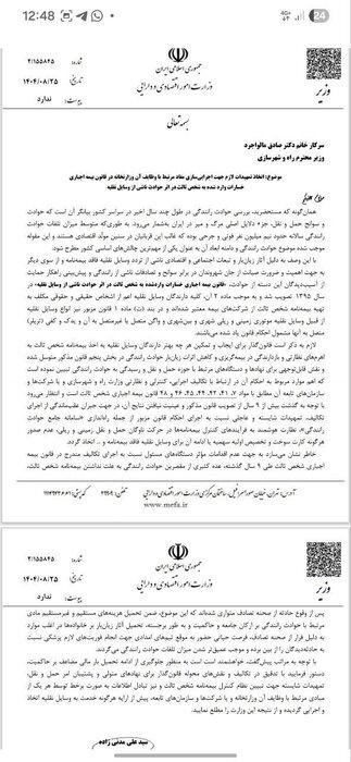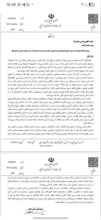 وزیر اقتصاد در نامه ای که به فرزانه صادق مالواجرد وزیر راه و شهرسازی نگاشته، به احکام مرتبط با تکالیف اجرایی، کنترلی و نظارتی وزارت راه و شهرسازی و شرکت ها و سازمان های تابعه آن طبق مواد ۷، ۴۱، ۴۲ ۴۴، ۴۵ ، ۴۶ و ۴۸ قانون بیمه اجباری شخص ثالث استناد کرده است.