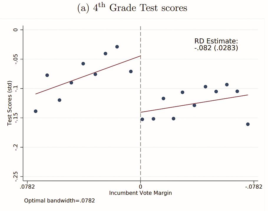 تأثیر نهایی این چرخشها بر دانشآموزان کاملاً قابل اندازهگیری است. در آزمونهای استاندارد ملی که در کلاسهای چهارم و هشتم ابتدایی برگزار میشود، نمرات دانشآموزان در شهرداریهایی که چرخش سیاسی رخ داده، کمتر از شهرداریهای مشابه بدون چرخش است. این کاهش اگرچه در نگاه اول کوچک به نظر میرسد، اما از نظر آموزشی بسیار معنادار است. افت ۰٫۰۸ انحراف معیار تقریباً معادل از دست دادن ۳۰ تا ۴۵ درصد پیشرفت تحصیلی سالانه یک دانشآموز معمولی است. این اثر نه تنها در سال اول، بلکه تا پنج سال پس از چرخش سیاسی نیز ادامه دارد و به تدریج کاهش مییابد، اما هرگز به طور کامل جبران نمیشود.