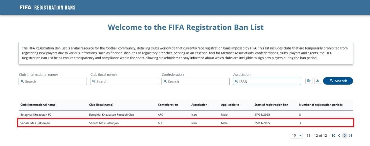 ایران آنلاینسامانه نقل‌وانتقالاتی سایت فدراسیون جهانی فوتبال (فیفا) در فهرست باشگاه‌های ایرانیِ محروم از نقل‌وانتقالات، نام باشگاه مس رفسنجان را اضافه کرد.