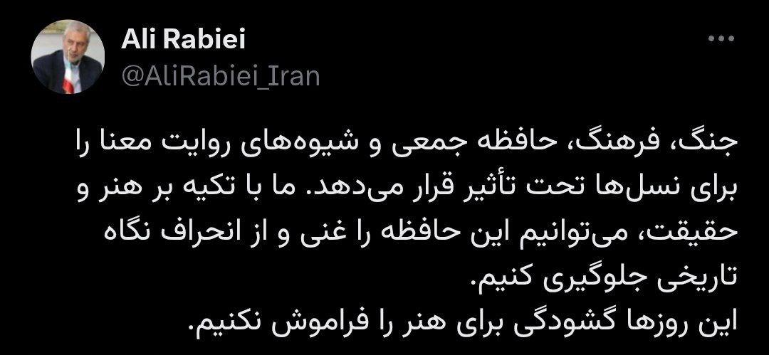 دستیار اجتماعی رئیسجمهور در پیامی در صفحه شخصی خود در شبکه اجتماعی ایکس عنوان کرد: با تکیه بر هنر و حقیقت، میتوانیم حافظه جمعی را غنی و از انحراف نگاه تاریخی جلوگیری کنیم.