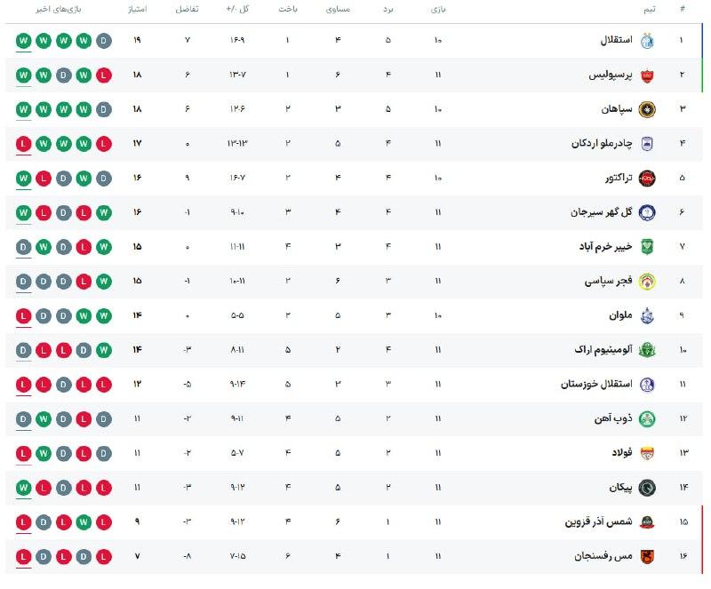 جدول لیگ برتر فوتبال در پایان هفتۀ یازدهم