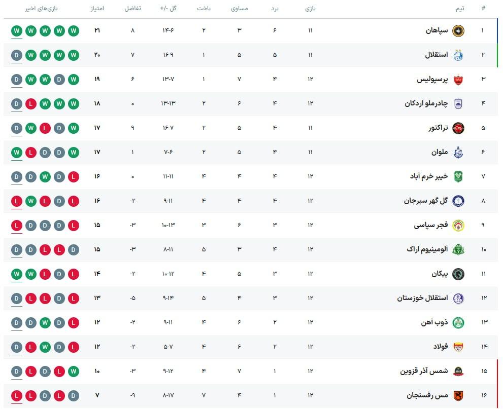 جدول لیگ برتر در پایان هفتۀ دوازدهم