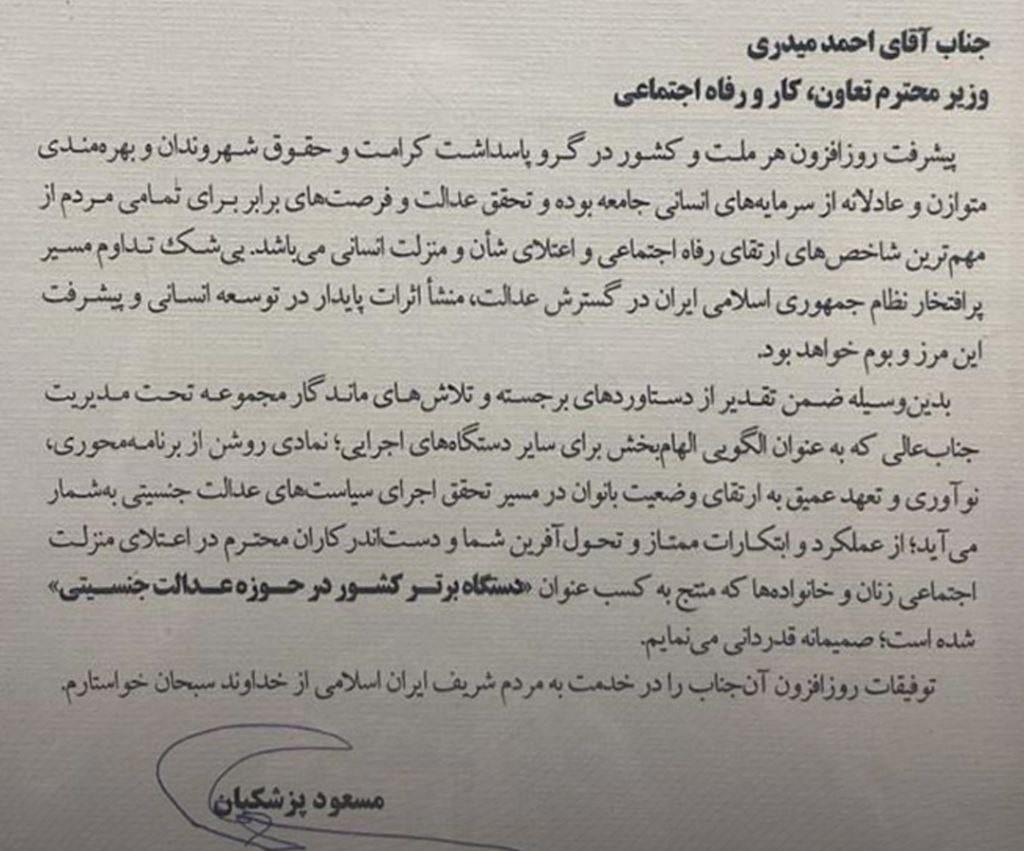 بدین وسیله ضمن تقدیر از دستاوردهای برجسته و تلاش های ماندگار مجموعه تحت مدیریت جنابعالی که به عنوان الگویی الهام بخش برای سایر دستگاه های اجرایی؛ نمادی روشن از برنامه محوری نوآوری و تعهد عمیق به ارتقای وضعیت بانوان در مسیر تحقق اجرای سیاستهای عدالت جنسیتی به شمار می آید؛ از عملکرد و ابتکارات ممتاز و تحول آفرین شما و دست اندرکاران محترم در اعتلای منزلت اجتماعی زنان و خانواده ها که منتج به کسب عنوان دستگاه برتر کشور در حوزه عدالت جنسیتی شده است؛ صمیمانه قدردانی می نمایم .
