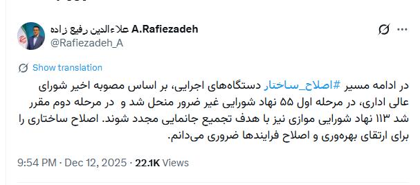 رفیع زاده در شبکه ایکس خبر از انحلال ۵۵ نهاد شورایی غیر ضروری داد.