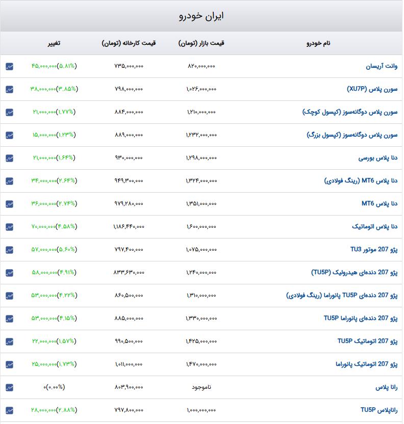 دنا پلاس بورسی، دنا پلاس MT۶ (رینگ فولادی)، دنا پلاس MT۶ ، سورن پلاس (XU۷P) و سورن پلاس دوگانهسوز (کپسول کوچک و بزرگ) افزایش قیمت بین ۱۵ تا ۳۸ میلیون تومانی داشتند.