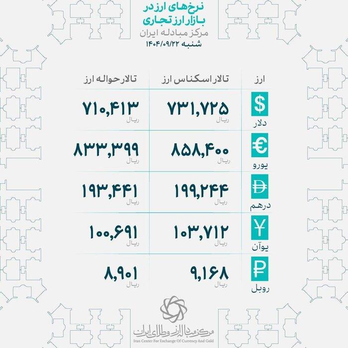 در مرکز مبادله ارز و طلای ایران به عنوان تالار رسمی مبادلات ارزی کشور، روز شنبه هر اسکناس دلار آمریکا در محدوده ۷۳ هزار و ۱۷۲ تومان، هر یورو ۸۵ هزار و ۸۴۰ تومان و هر درهم امارات ۱۹ هزار ۹۲۴ تومان به فروش رفت.
